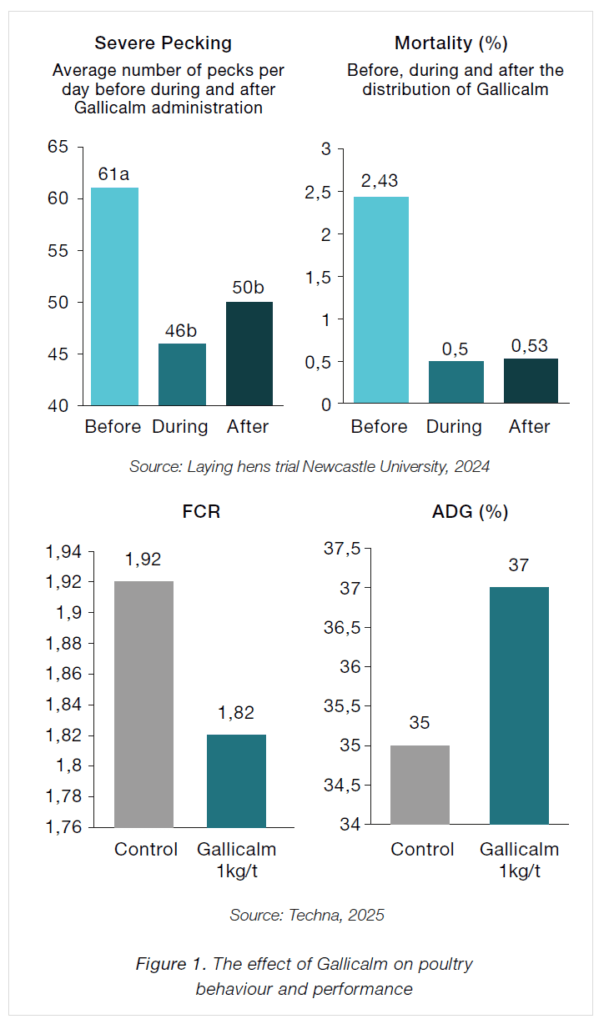 Gallicalm is a targeted phytogenic blend of aromatic substances and plant extracts, specifically formulated to control the negative effects of nervousness in poultry production. Its efficacy has been demonstrated in trials with laying hens, where it helped limit inappropriate behaviour such as feather pecking and scratching. Beyond behavioral improvements, Gallicalm also supports zootechnical performance (Figure 1).