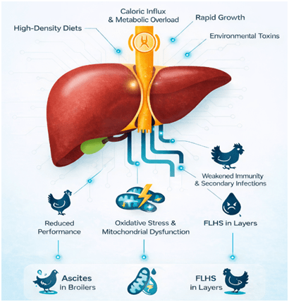Modern intensive poultry production systems require birds to perform at the upper limits of their physiological capacity. Rapid growth rates, improved feed conversion ratios (FCR), high egg output, and energy-dense diets impose substantial metabolic pressure on the liver — the central organ responsible for nutrient metabolism, lipid transport, detoxification, and immune modulation (Hermier, 1997; Julian, 2005). Under such conditions, hepatic resilience becomes a decisive determinant of flock productivity, health, and profitability. Conventional hepatoprotective strategies have historically focused on single lipotropic nutrients, primarily choline. While these interventions assist in lipid export, they often fail to address oxidative injury, inflammatory stress, mitochondrial dysfunction, and limitations in nutraceutical bioavailability (Zeisel & da Costa, 2009; Surai, 2014). Therefore, a multi-targeted hepatomodulatory strategy is required to sustain metabolic efficiency in modern production systems.