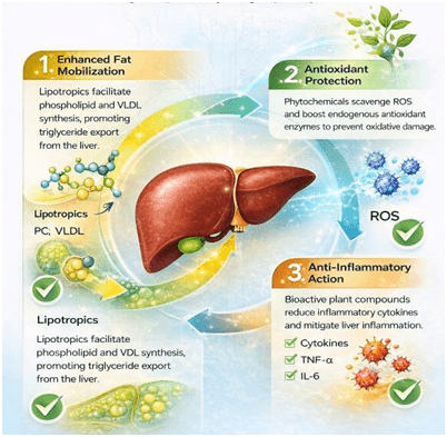 Lipotropic agents play a central role in hepatic lipid metabolism by facilitating the mobilization and export of triglycerides from the liver. They promote phospholipid synthesis and very-low-density lipoprotein (VLDL) assembly, thereby enhancing lipid transport and preventing hepatic fat accumulation (Lakshmi & Padmaja, 2021; Zeisel & da Costa, 2009). Phytochemicals, on the other hand, provide pleiotropic hepatoprotective effects by modulating multiple molecular pathways involved in oxidative stress, inflammation, and cellular signalling. Many plant-derived bioactive compounds activate antioxidant defence systems (e.g., Nrf2 pathway) and suppress pro-inflammatory mediators (e.g., NF-κB signaling), thereby protecting hepatic tissue from metabolic and toxin-induced damage (Surai, 2002; Almohmadi et al., 2024). The synergistic integration of Lipotropics and phytochemicals offers a dual-action approach — optimizing hepatic lipid metabolism while simultaneously strengthening antioxidant and anti-inflammatory defences.