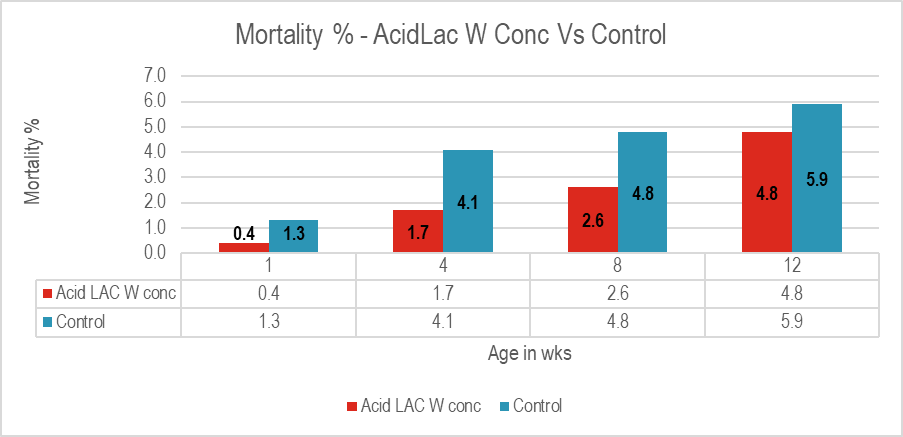 Over the 12-week trial period, the group receiving AcidLAC™ W Conc. Liquid exhibited a 1.1% lower mortality rate compared to the control group. Detailed chick and grower mortality data for both groups are presented in Figure 1.