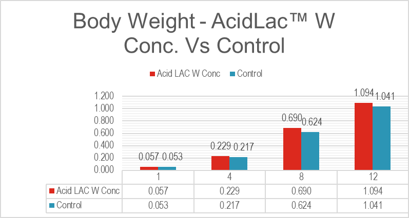 For the total trial period of 12 weeks, the AcidLAC™ W Conc. group had a higher body weight of 53g when compared to the control group. Body weight details of the AcidLAC™ W conc and control group are given as a graphical representation of body weight for both trial and control groups in Figure 2.