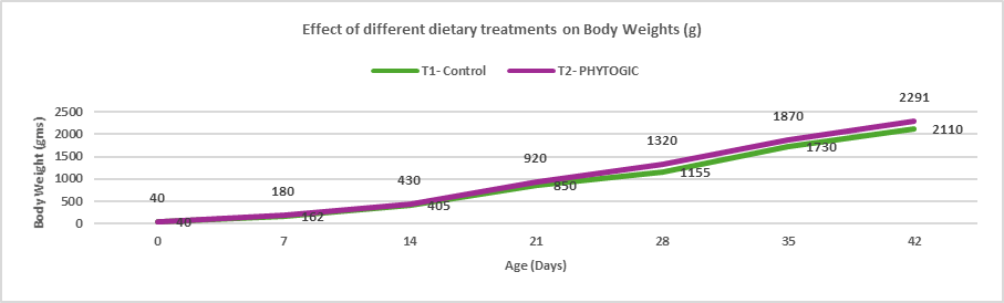 Effect of Supplementation of Phytogic on body growth performance parameters like Body Weights, Feed Consumption, FCR and Average Daily gain of Control and Treatment Groups
