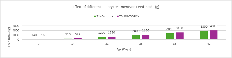 Conclusion:Broilers in the T2 – PHYTOGIC group fed at 150g/ton of feed consumed more feed (4015 g) compared to the T1 – Control group (3800 g), showing a 5.50% increase in feed intake. This suggests that PHYTOGIC supplementation may enhance feed consumption in broilers.