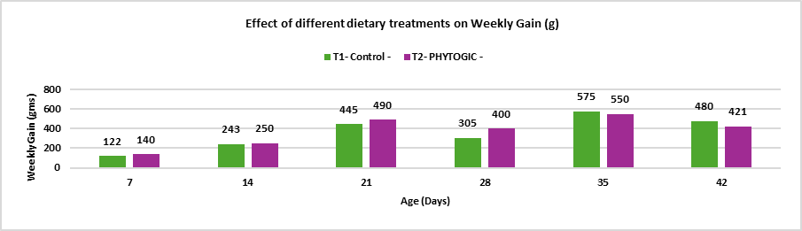 Conclusion: The average weekly percentage difference in weight gain between T2 – PHYTOGIC fed at 150g/ton of feed and T1 – Control was -3.84%, indicating that, overall, PHYTOGIC supplementation did not improve weekly weight gain in broilers and was slightly less effective than the control in this trial.