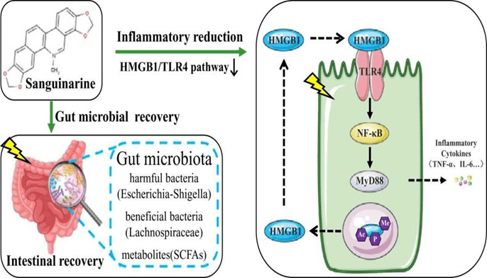 Sanguinarine helps reduce inflammation by blocking key signals that trigger the body’s inflammatory response. When cells are damaged, they release a protein called HMGB1, which acts as a danger signal and activates immune cells. Sanguinarine helps prevent the release of HMGB1 and reduces its ability to trigger inflammation.It also blocks a receptor called TLR4 on immune cells. Normally, TLR4 detects harmful signals like HMGB1 and activates further inflammatory pathways. By interfering with this receptor, sanguinarine stops the signal from spreading.In addition, sanguinarine inhibits NF-κB, a major protein that turns on genes responsible for producing inflammatory chemicals. By preventing NF-κB activation, sanguinarine reduces the production of pro-inflammatory cytokines such as TNF-α, IL-6, and IL-1β. Sanguinarine exerts anti-inflammatory effects by targeting the HMGB1–TLR4–NF-κB signaling axis at multiple levels. Overall, sanguinarine lowers inflammation, limits tissue damage, and helps protect organs, especially in inflammatory conditions of the gut and other tissues (Gu et al., 2022).