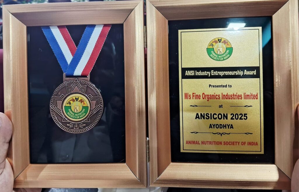 At the 21st Biennial International conference of the Animal Nutrition society of India (ANSICON 2025), held from 19 to 21, 2025, Fine Organic Industries Limited was honoured with the Prestigious “ANSI Industry Entrepreneurship Award 2025.”