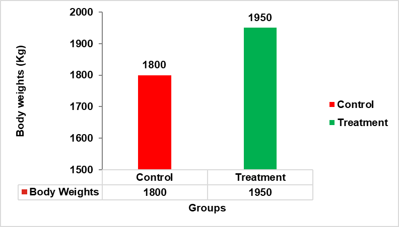 The average body weight of broiler birds treated with water acidifier from the control vs treatment group is given in Figure 1. For the total trial period of 35 days, the treatment group AcidLAC™ W Conc. Liquid had a higher average body weight of 150g when compared to the control group.