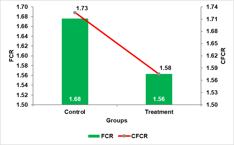 Figures 3: Effect of trial groups on FCR and CFCR of broiler birds.
