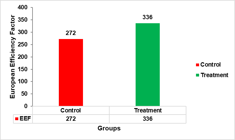 In economic terms, the cost of production expressed per live broiler bird produced was lower by 9 rupees 11 paise (INR 9.11) in the treatment group than in the control group, which demonstrated a return on investment (ROI) of 16:1 in favour of the treatment group (Table 2).