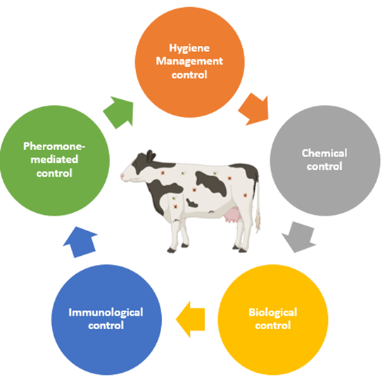 1. Hygiene Management control: One strategy to control fly populations is the systematic removal of dung and manure, coupled with the implementation of proper drainage systems to eliminate breeding grounds. Manure can be consolidated into large heaps where the heat generated during fermentation can effectively destroy fly larvae. Additionally, the application of insecticides on smaller manure heaps can further reduce the prevalence of flies. Grazing practices should be intensified to minimize vegetation growth, supplemented by periodic plowing and cultivation of grazing areas to create an inhospitable environment for ticks and their developmental stages. In regions where pastureland is scarce, ticks may seek refuge in cracks and crevices within animal shelters, necessitating measures to minimize such habitats. Regular grooming of animals and the installation of wire mesh or nets around animal enclosures can also aid in tick control efforts.