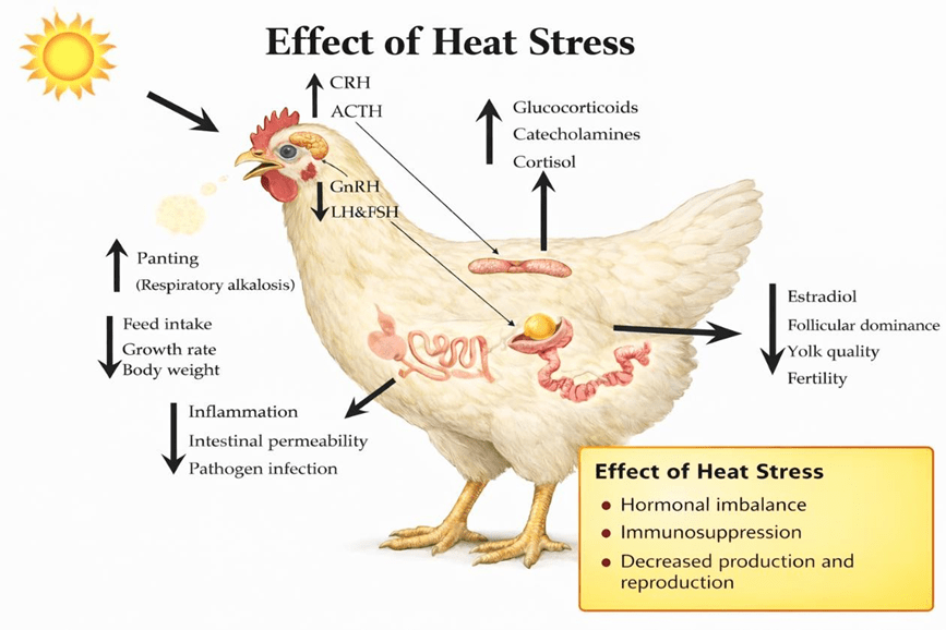 Managing heat stress in poultry demands a proactive, integrated approach that addresses environmental, nutritional, and physiological challenges. By implementing effective ventilation, water management, and dietary adjustments—such as reducing protein levels and incorporating electrolytes producers can mitigate the adverse effects on broilers, layers, and breeders, including reduced feed intake, egg production declines, and fertility issues. Supplements play a vital role in restoring electrolyte balance, boosting immunity, and countering oxidative stress, potentially recovering up to 80% of performance losses. As global temperatures continue to rise, prioritizing these strategies not only enhances flock welfare and productivity but also ensures the long-term viability of poultry operations in an increasingly unpredictable climate.