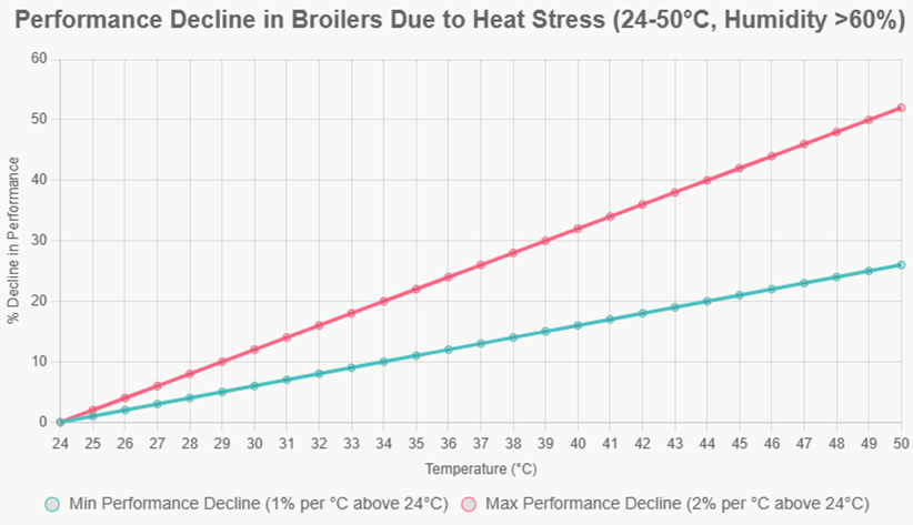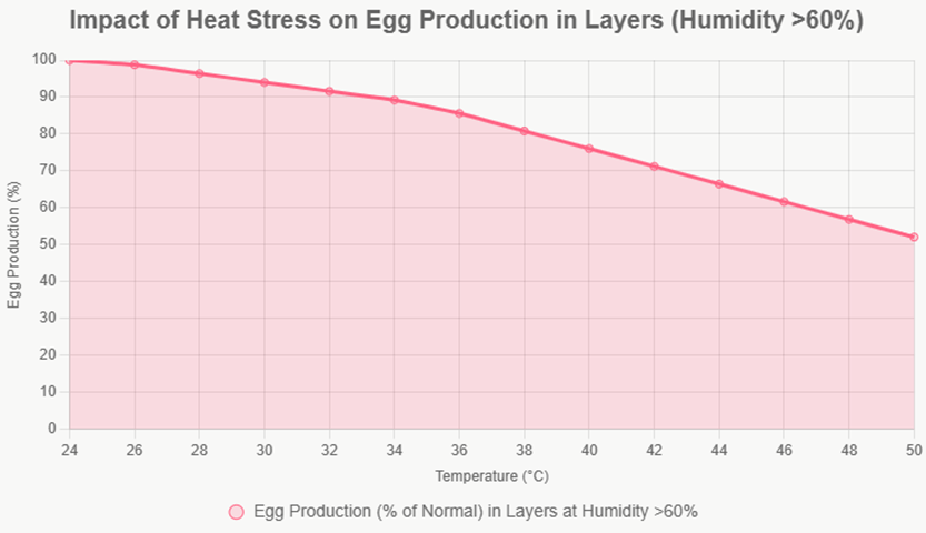 Birds maintain constant body temperatures through various cooling mechanisms. Unlike mammals, poultry lack sweat glands and rely primarily on respiratory evaporation and behavioural adaptations to dissipate heat. When environmental temperatures exceed their cooling capacity, birds experience thermal distress. Observable signs include accelerated respiration, reduced activity, drooping wings, and changes in comb coloration. Without intervention, these symptoms progress can severe dehydration, metabolic imbalances, and potentially fatal outcomes, with mortality reaching 10-20% in extreme cases.