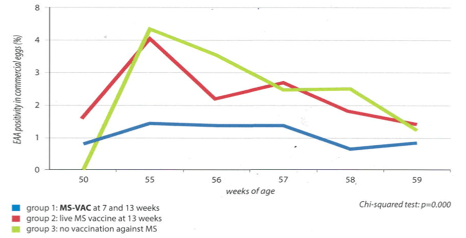 A significantly lower (p=0,000) percentage of EAA affected eggs was observed in group 1 than in groups 2 and 3 (statistically significant difference for p<0.001).Thus, MS-VAC proved to be effective in protecting commercial hens from EAA, significantly more than the competitiors, in farms infected with MS.