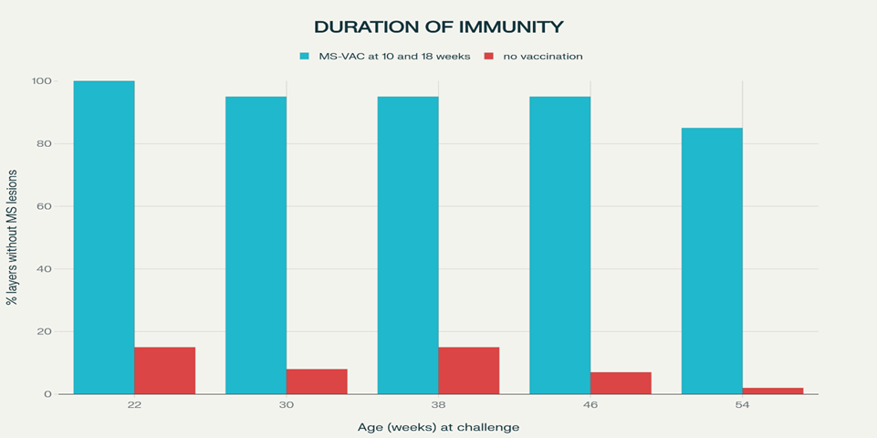 Fig. 5 Duration of immunity in MS-VAC (3 weeks after challenging with virulent MS) MS-VAC is a vaccine produced from highly immunogenic strains of Mycoplasma synoviae. The culture is inactivated and emulsified in light mineral oil, to ensure a high degree of protection after first vaccination, however the immunity is strongest and long lasting after second inoculation. Ø Clinical observation of egg laid, in vaccinated and non vaccinated commercial hens, after infection by field MS.