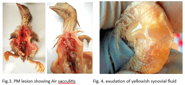 - Joints and musculoskeletal system: Ø Synovitis: Swollen joints (particularly hock, wing and foot joints) with accumulation of yellow to serofibrinous exudate.Ø Tenosynovitis: Inflamed tendon sheaths filled with exudate.