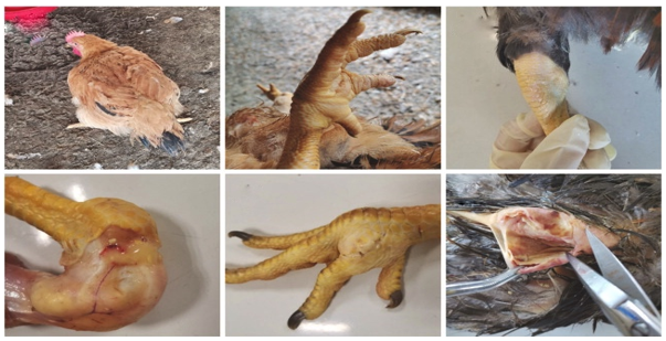 Fig.2. Dull, depressed hen, Inflammation of foot pad, hock joint and cavity filled with exudates