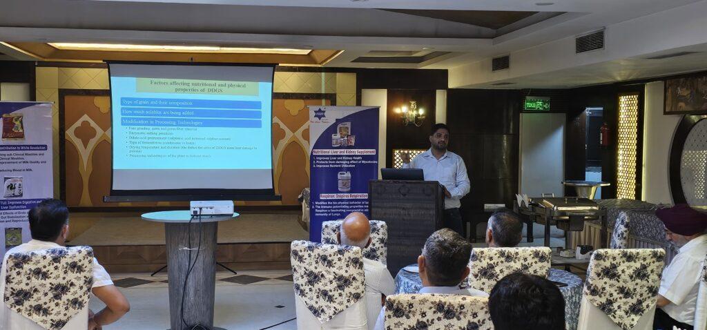 Mr Pawan Vij, from M/s Vesper Group highlighted the importance of immunity at a dairy farm. He advocated to restrict the movement of strangers in their farm. He introduced the products Toxol, Masticare & Apthocare to the animal nutritionists. He presented their silent features and likely benefits related to liver, toxicity, and immunity of the animals.