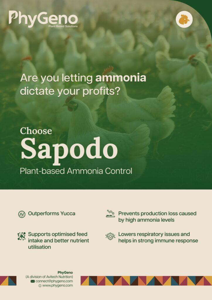PhyGeno, the plant-based feed ingredient division of Avitech Nutrition is dedicated to enhancing the safety and nutritive value of animals through plant-based innovations. Drawing on its legacy of working with animals and combining ancient Ayurvedic knowledge with modern evaluation and manufacturing techniques, PhyGeno offers solutions that lead to healthier products for human consumption and minimal environmental impact. Sapodo, a polyherbal formulation is rapidly emerging as a natural choice to address critical ammonia challenges in poultry farming.