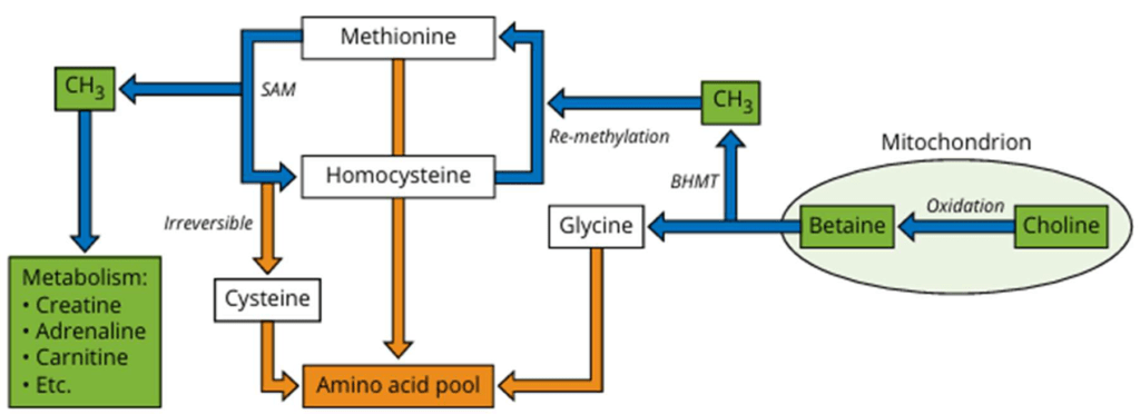 Betaine can replace both choline and methionine (partially) in poultry diets because it directly supplies methyl groups, a role otherwise fulfilled by choline (after its conversion to betaine in the liver) and methionine through the methionine cycle (Figure 1). Unlike choline, betaine does not require metabolic conversion to become active, making it a more efficient methyl donor. This methyl contribution provides a methionine-sparing effect, allowing more dietary methionine to be used for protein synthesis. Practical broiler trials with betaine have shown that partial replacement of choline chloride and DL-methionine can be achieved without compromising growth, while often improving feed conversion and gut health.