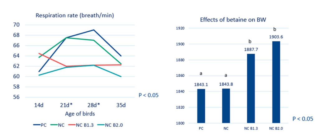 A broiler study conducted under hot environment (27-36°C) in India with a supplementation of betaine hydrochloride at 0.13% and 0.20% on top of a negative control (with reduced choline chloride and methionine). Betaine significantly reduced respiration rate (panting: Figure 2) and rectal temperature at 21 and 28 days of age (P < 0.05) and remained numerically lower at 35 days of age. Both betaine-fed groups had a significantly higher final body weight (P < 0.05: Figure 3).