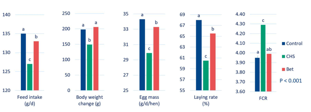 The effect of betaine on laying hens from 32 to 48 weeks of age exposed to chronic heat stress (CHS: 11:00 to 15:00, 38°C ± 1, 55-65% Relative Humidity (RH) for 3 consecutive days per week) was studied. Betaine supplementation (1 kg/MT) on chronic heat stressed group significantly improved body weight, laying rate, egg weight, and egg mass (Figure 4), as compared to those without betaine supplementation.